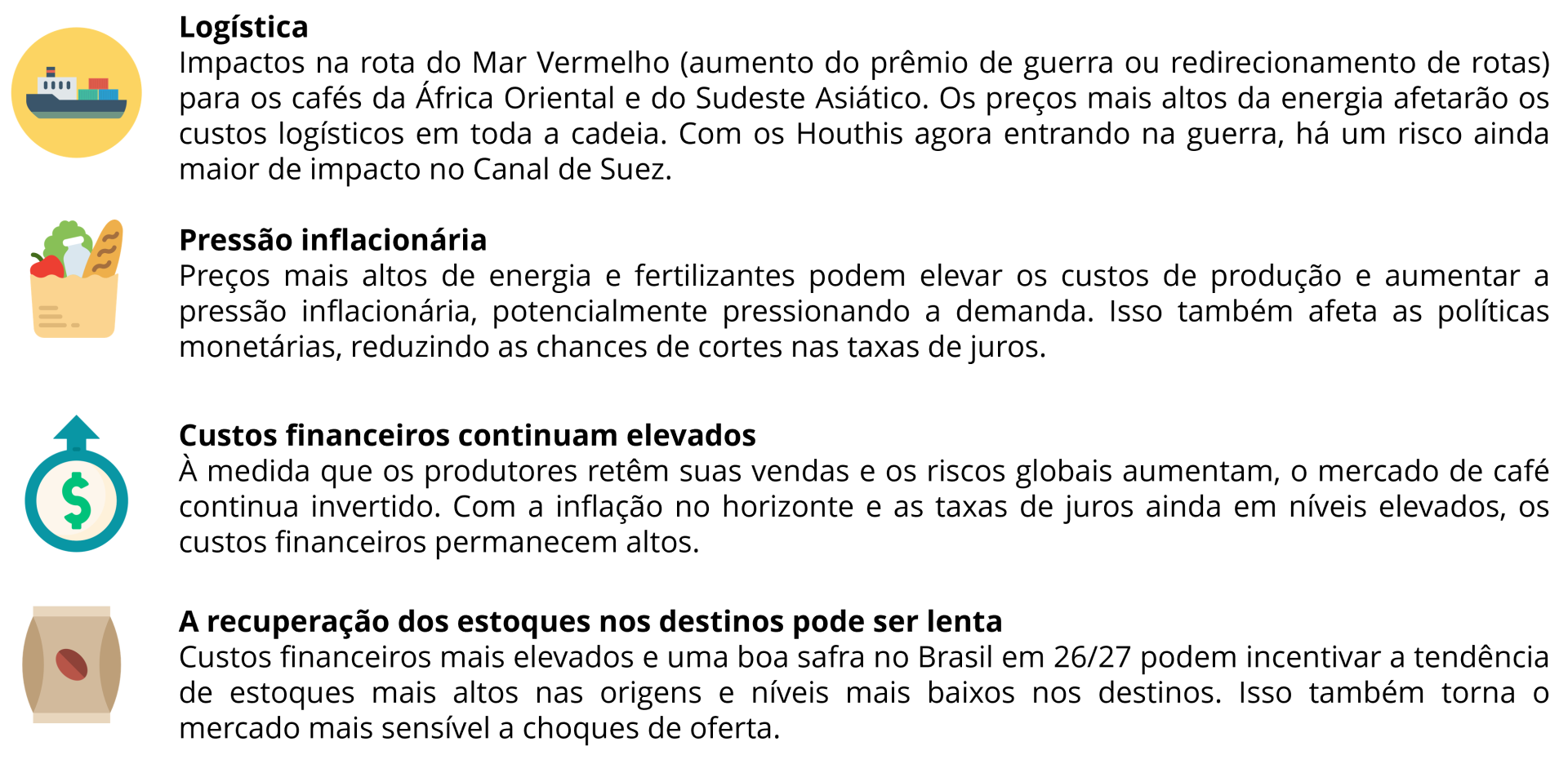 • Baixos estoques nos destinos podem provocar um aumento nos preços à medida que os compradores entram no mercado;