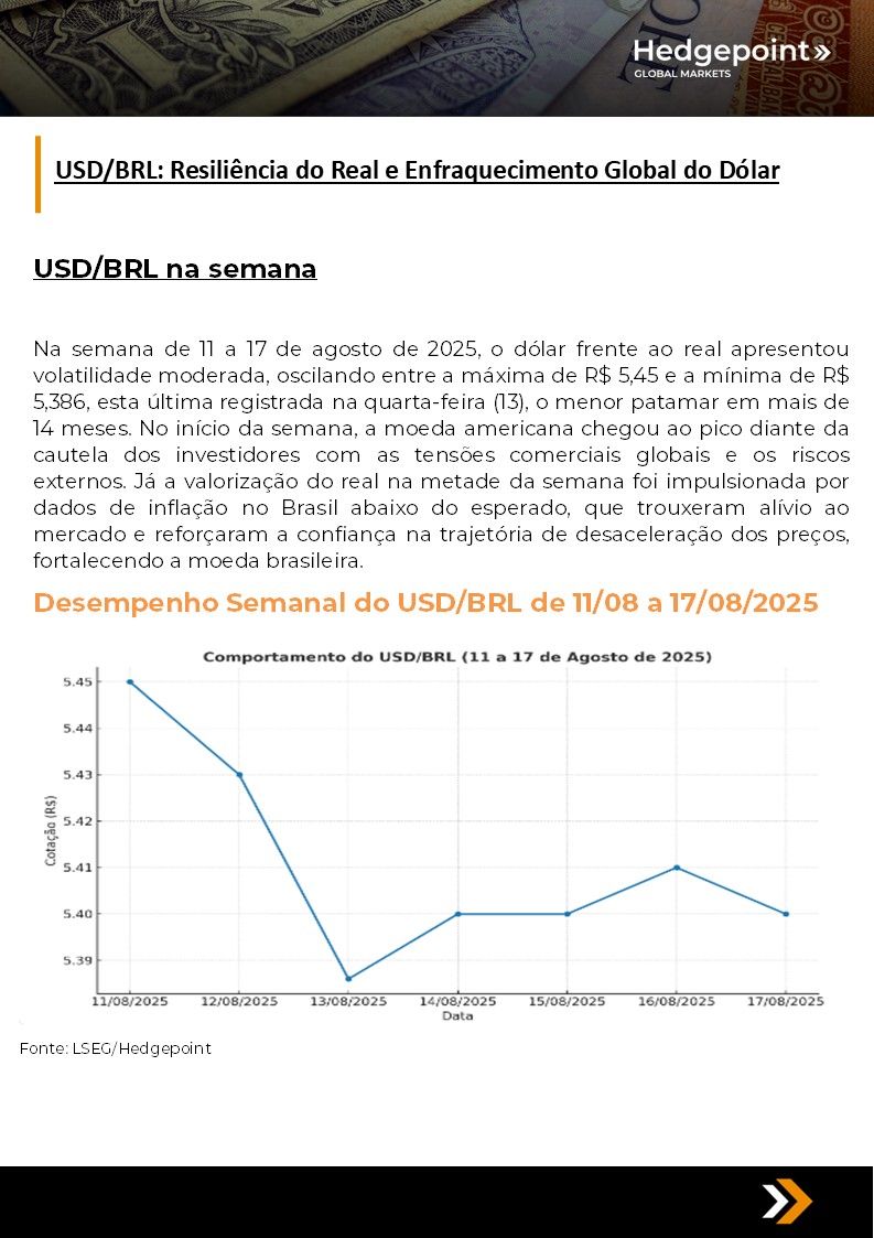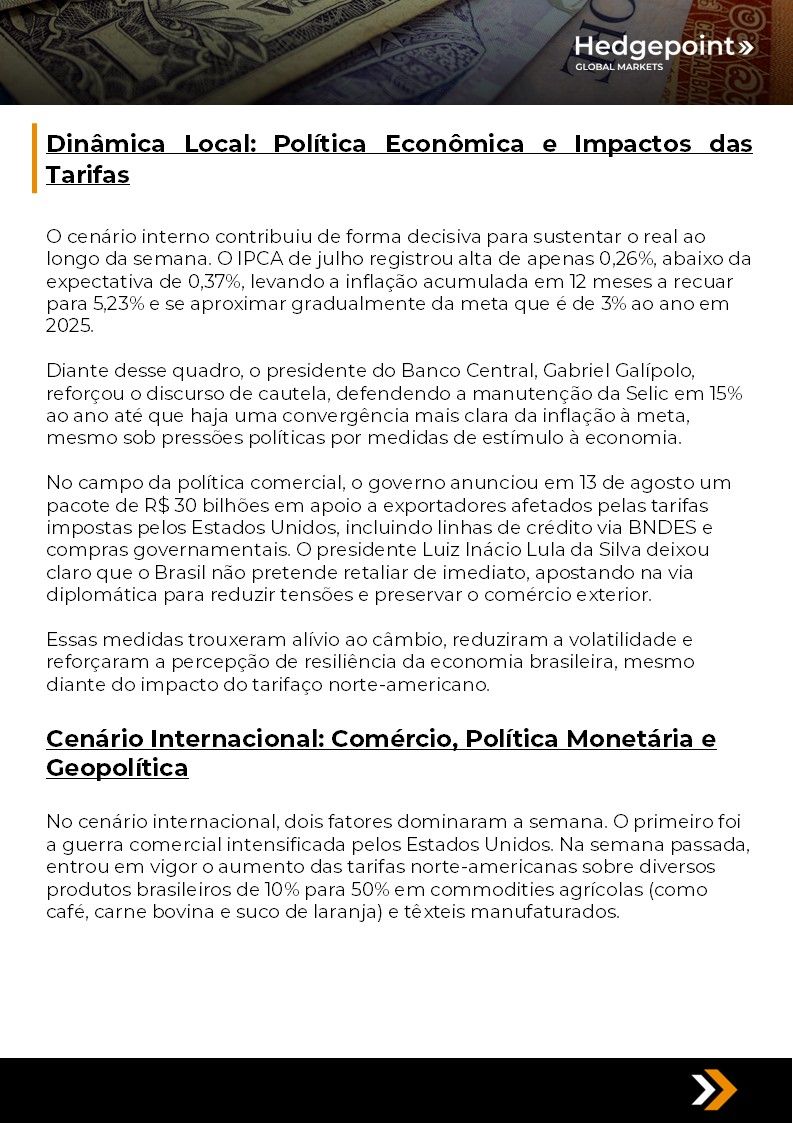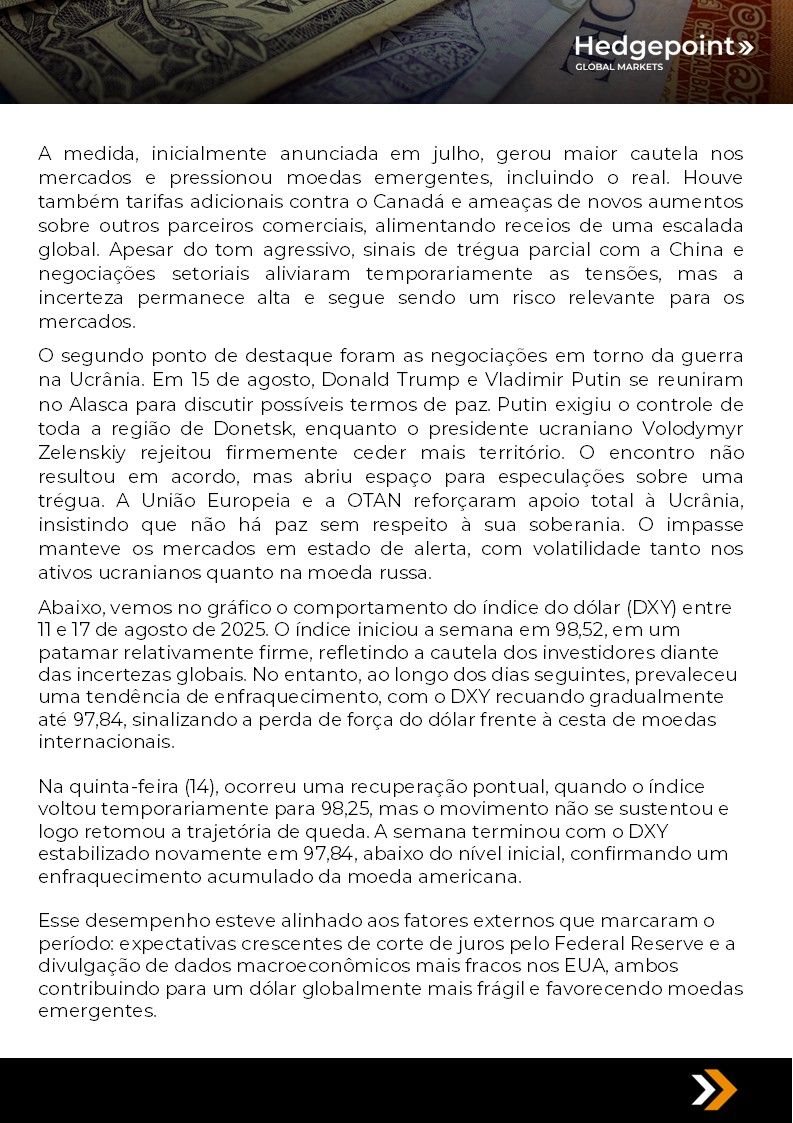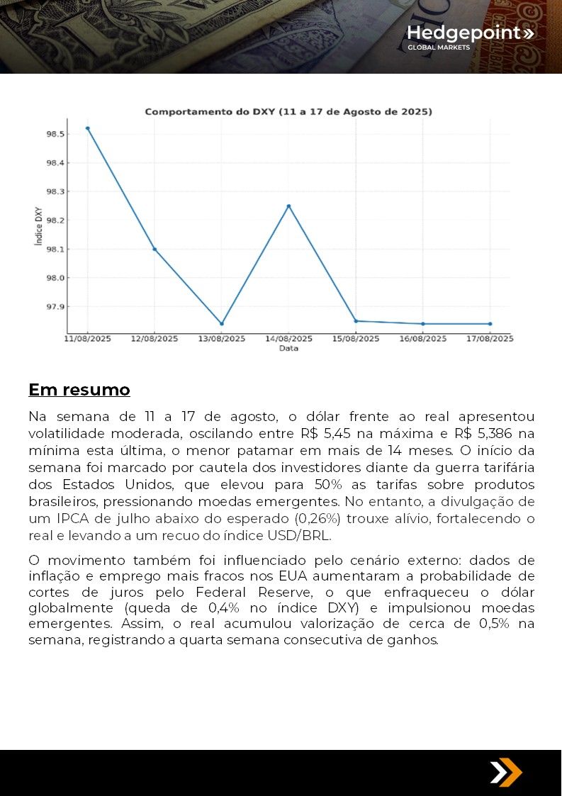 Este documento foi preparado pela Hedgepoint Schweiz AG e suas afiliadas (“Hedgepoint”) exclusivamente para fins informativos e instrutivos, sem a intenção de criar obrigações ou compromissos com terceiros. Não se destina a promover ou solicitar uma oferta de venda ou compra de quaisquer valores mobiliários, commodity interests ou produtos de investimento. A Hedgepoint e suas associadas renunciam expressamente a qualquer responsabilidade pelo uso das informações contidas neste documento que resulte, direta ou indiretamente, em qualquer tipo de dano. As informações são obtidas de fontes que acreditamos serem confiáveis, mas não garantimos a atualidade ou precisão dessas informações. O trading de commodity interests, como futuros, opções e swaps, envolve um risco substancial de perda e pode não ser adequado para todos os investidores. Você deve considerar cuidadosamente se esse tipo de negociação é adequado para você, levando em conta sua condição financeira. O desempenho passado não é necessariamente indicativo de resultados futuros. Os clientes devem confiar em seu próprio julgamento independente e/ou consultar seus consultores antes de realizar qualquer transação. A Hedgepoint não fornece consultoria jurídica, tributária ou contábil, sendo de sua responsabilidade buscar essas orientações separadamente. A Hedgepoint Schweiz AG está organizada, constituída e existente sob as leis da Suíça, é afiliada à ARIF, a Associação Romande des Intermédiaires Financiers, que é uma Organização de Autorregulação autorizada pela FINMA. A Hedgepoint Commodities LLC está organizada, constituída e existente sob as leis dos Estados Unidos, sendo autorizada e regulada pela Commodity Futures Trading Commission (CFTC) e é membro da National Futures Association (NFA), atuando como Introducing Broker e Commodity Trading Advisor. A HedgePoint Global Markets Limited é regulada pela Dubai Financial Services Authority. O conteúdo é direcionado a Clientes Profissionais e não a Clientes de Varejo. A Hedgepoint Global Markets PTE. Ltd está organizada, constituída e existente sob as leis de Singapura, isenta de obter uma licença de serviços financeiros conforme o Segundo Anexo do Securities and Futures (Licensing and Conduct of Business) Act, pela Monetary Authority of Singapore (MAS). A Hedgepoint Global Markets DTVM Ltda. é autorizada e regulada no Brasil pelo Banco Central do Brasil (BCB) e pela Comissão de Valores Mobiliários (CVM). Hedgepoint Serviços Ltda. está organizada, constituída e existente sob as leis do Brasil. A Hedgepoint Global Markets S.A. está organizada, constituída e existente sob as leis do Uruguai. Em caso de dúvidas não resolvidas no primeiro contato com o atendimento ao cliente (client.services@hedgepointglobal.com), entre em contato com o canal de ouvidoria interna (ombudsman@hedgepointglobal.com – global ou ouvidoria@hedgepointglobal.com – apenas Brasil) ou ligue para 0800-8788408 (apenas Brasil). Integridade, ética e transparência são valores que guiam nossa cultura. Para fortalecer ainda mais nossas práticas, a Hedgepoint possui um canal de denúncias para colaboradores e terceiros via e-mail ethicline@hedgepointglobal.com ou pelo formulário Ethic Line – Hedgepoint Global Markets. “HedgePoint” e o logotipo “HedgePoint” são marcas de uso exclusivo da HedgePoint e/ou de suas afiliadas. O uso ou reprodução é proibido, a menos que expressamente autorizado pela HedgePoint. Além disso, o uso de outras marcas neste documento foi autorizado apenas para fins de identificação. Isso, portanto, não implica quaisquer direitos da HedgePoint sobre essas marcas ou implica endosso, associação ou aprovação pelos proprietários dessas marcas com a HedgePoint ou suas afiliadas.