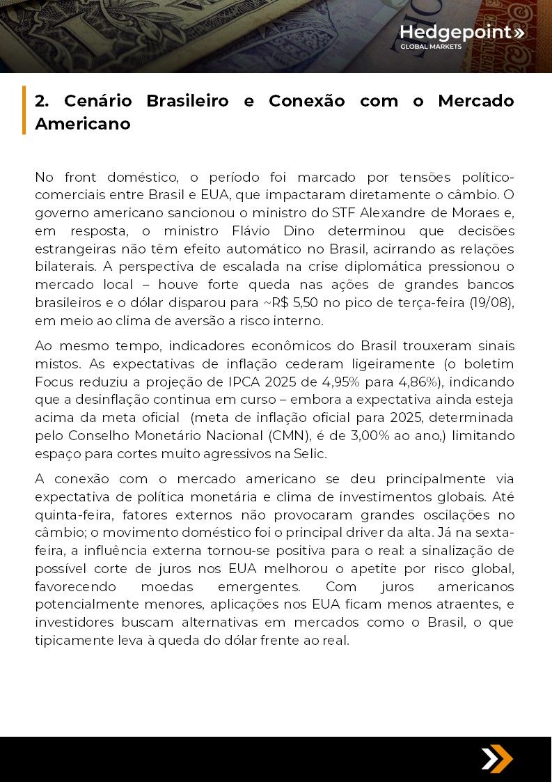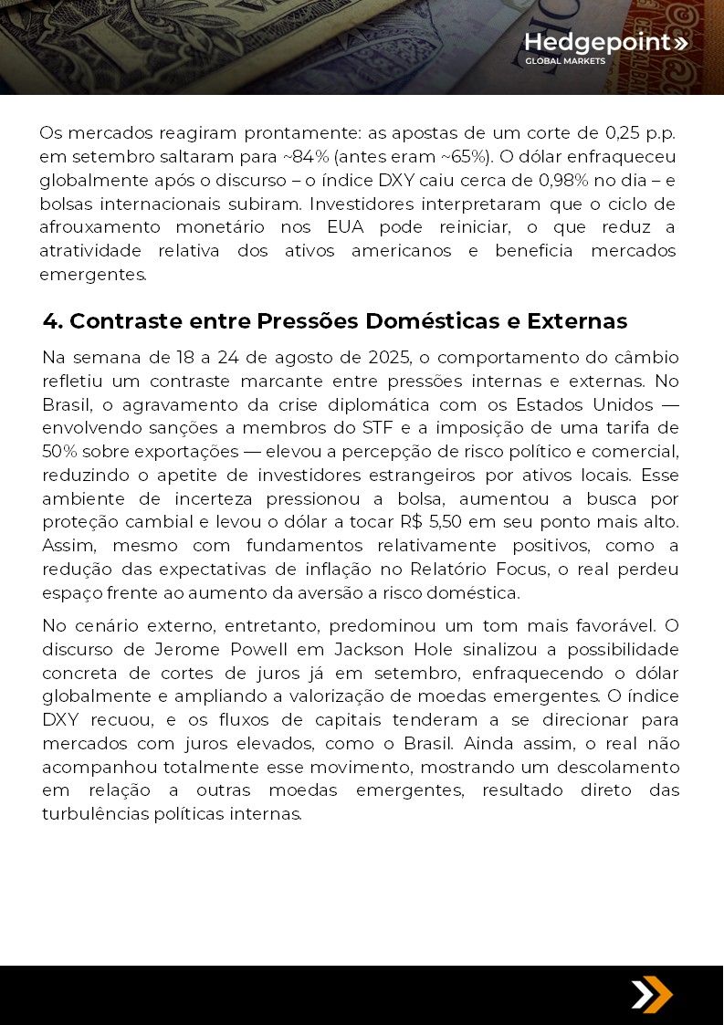 Este documento foi preparado pela Hedgepoint Schweiz AG e suas afiliadas (“Hedgepoint”) exclusivamente para fins informativos e instrutivos, sem a intenção de criar obrigações ou compromissos com terceiros. Não se destina a promover ou solicitar uma oferta de venda ou compra de quaisquer valores mobiliários, commodity interests ou produtos de investimento. A Hedgepoint e suas associadas renunciam expressamente a qualquer responsabilidade pelo uso das informações contidas neste documento que resulte, direta ou indiretamente, em qualquer tipo de dano. As informações são obtidas de fontes que acreditamos serem confiáveis, mas não garantimos a atualidade ou precisão dessas informações. O trading de commodity interests, como futuros, opções e swaps, envolve um risco substancial de perda e pode não ser adequado para todos os investidores. Você deve considerar cuidadosamente se esse tipo de negociação é adequado para você, levando em conta sua condição financeira. O desempenho passado não é necessariamente indicativo de resultados futuros. Os clientes devem confiar em seu próprio julgamento independente e/ou consultar seus consultores antes de realizar qualquer transação. A Hedgepoint não fornece consultoria jurídica, tributária ou contábil, sendo de sua responsabilidade buscar essas orientações separadamente. A Hedgepoint Schweiz AG está organizada, constituída e existente sob as leis da Suíça, é afiliada à ARIF, a Associação Romande des Intermédiaires Financiers, que é uma Organização de Autorregulação autorizada pela FINMA. A Hedgepoint Commodities LLC está organizada, constituída e existente sob as leis dos Estados Unidos, sendo autorizada e regulada pela Commodity Futures Trading Commission (CFTC) e é membro da National Futures Association (NFA), atuando como Introducing Broker e Commodity Trading Advisor. A HedgePoint Global Markets Limited é regulada pela Dubai Financial Services Authority. O conteúdo é direcionado a Clientes Profissionais e não a Clientes de Varejo. A Hedgepoint Global Markets PTE. Ltd está organizada, constituída e existente sob as leis de Singapura, isenta de obter uma licença de serviços financeiros conforme o Segundo Anexo do Securities and Futures (Licensing and Conduct of Business) Act, pela Monetary Authority of Singapore (MAS). A Hedgepoint Global Markets DTVM Ltda. é autorizada e regulada no Brasil pelo Banco Central do Brasil (BCB) e pela Comissão de Valores Mobiliários (CVM). Hedgepoint Serviços Ltda. está organizada, constituída e existente sob as leis do Brasil. A Hedgepoint Global Markets S.A. está organizada, constituída e existente sob as leis do Uruguai. Em caso de dúvidas não resolvidas no primeiro contato com o atendimento ao cliente (client.services@hedgepointglobal.com), entre em contato com o canal de ouvidoria interna (ombudsman@hedgepointglobal.com – global ou ouvidoria@hedgepointglobal.com – apenas Brasil) ou ligue para 0800-8788408 (apenas Brasil). Integridade, ética e transparência são valores que guiam nossa cultura. Para fortalecer ainda mais nossas práticas, a Hedgepoint possui um canal de denúncias para colaboradores e terceiros via e-mail ethicline@hedgepointglobal.com ou pelo formulário Ethic Line – Hedgepoint Global Markets. “HedgePoint” e o logotipo “HedgePoint” são marcas de uso exclusivo da HedgePoint e/ou de suas afiliadas. O uso ou reprodução é proibido, a menos que expressamente autorizado pela HedgePoint. Além disso, o uso de outras marcas neste documento foi autorizado apenas para fins de identificação. Isso, portanto, não implica quaisquer direitos da HedgePoint sobre essas marcas ou implica endosso, associação ou aprovação pelos proprietários dessas marcas com a HedgePoint ou suas afiliadas.