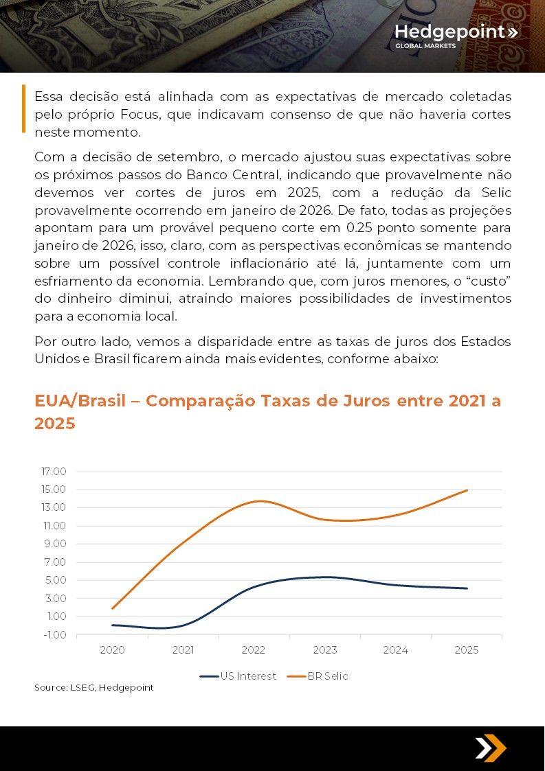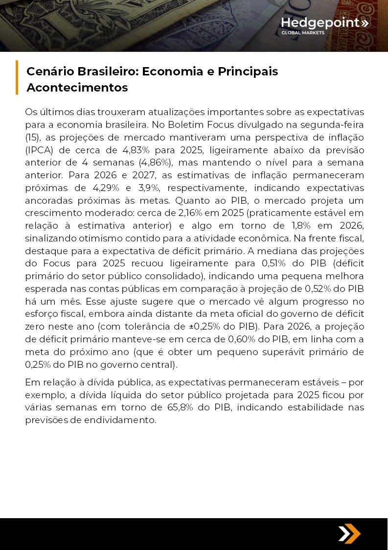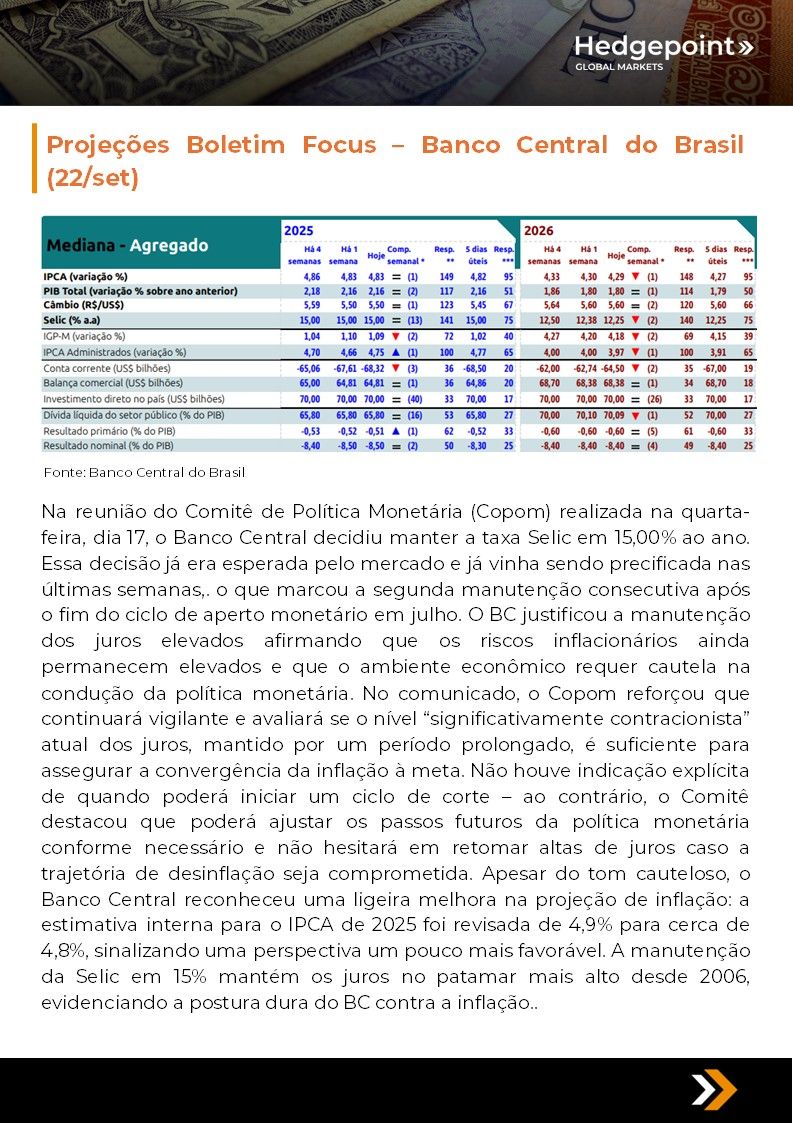 Este documento foi preparado pela Hedgepoint Schweiz AG e suas afiliadas (“Hedgepoint”) exclusivamente para fins informativos e instrutivos, sem a intenção de criar obrigações ou compromissos com terceiros. Não se destina a promover ou solicitar uma oferta de venda ou compra de quaisquer valores mobiliários, commodity interests ou produtos de investimento. A Hedgepoint e suas associadas renunciam expressamente a qualquer responsabilidade pelo uso das informações contidas neste documento que resulte, direta ou indiretamente, em qualquer tipo de dano. As informações são obtidas de fontes que acreditamos serem confiáveis, mas não garantimos a atualidade ou precisão dessas informações. O trading de commodity interests, como futuros, opções e swaps, envolve um risco substancial de perda e pode não ser adequado para todos os investidores. Você deve considerar cuidadosamente se esse tipo de negociação é adequado para você, levando em conta sua condição financeira. O desempenho passado não é necessariamente indicativo de resultados futuros. Os clientes devem confiar em seu próprio julgamento independente e/ou consultar seus consultores antes de realizar qualquer transação. A Hedgepoint não fornece consultoria jurídica, tributária ou contábil, sendo de sua responsabilidade buscar essas orientações separadamente. A Hedgepoint Schweiz AG está organizada, constituída e existente sob as leis da Suíça, é afiliada à ARIF, a Associação Romande des Intermédiaires Financiers, que é uma Organização de Autorregulação autorizada pela FINMA. A Hedgepoint Commodities LLC está organizada, constituída e existente sob as leis dos Estados Unidos, sendo autorizada e regulada pela Commodity Futures Trading Commission (CFTC) e é membro da National Futures Association (NFA), atuando como Introducing Broker e Commodity Trading Advisor. A HedgePoint Global Markets Limited é regulada pela Dubai Financial Services Authority. O conteúdo é direcionado a Clientes Profissionais e não a Clientes de Varejo. A Hedgepoint Global Markets PTE. Ltd está organizada, constituída e existente sob as leis de Singapura, isenta de obter uma licença de serviços financeiros conforme o Segundo Anexo do Securities and Futures (Licensing and Conduct of Business) Act, pela Monetary Authority of Singapore (MAS). A Hedgepoint Global Markets DTVM Ltda. é autorizada e regulada no Brasil pelo Banco Central do Brasil (BCB) e pela Comissão de Valores Mobiliários (CVM). Hedgepoint Serviços Ltda. está organizada, constituída e existente sob as leis do Brasil. A Hedgepoint Global Markets S.A. está organizada, constituída e existente sob as leis do Uruguai. Em caso de dúvidas não resolvidas no primeiro contato com o atendimento ao cliente (client.services@hedgepointglobal.com), entre em contato com o canal de ouvidoria interna (ombudsman@hedgepointglobal.com – global ou ouvidoria@hedgepointglobal.com – apenas Brasil) ou ligue para 0800-8788408 (apenas Brasil). Integridade, ética e transparência são valores que guiam nossa cultura. Para fortalecer ainda mais nossas práticas, a Hedgepoint possui um canal de denúncias para colaboradores e terceiros via e-mail ethicline@hedgepointglobal.com ou pelo formulário Ethic Line – Hedgepoint Global Markets. “HedgePoint” e o logotipo “HedgePoint” são marcas de uso exclusivo da HedgePoint e/ou de suas afiliadas. O uso ou reprodução é proibido, a menos que expressamente autorizado pela HedgePoint. Além disso, o uso de outras marcas neste documento foi autorizado apenas para fins de identificação. Isso, portanto, não implica quaisquer direitos da HedgePoint sobre essas marcas ou implica endosso, associação ou aprovação pelos proprietários dessas marcas com a HedgePoint ou suas afiliadas.