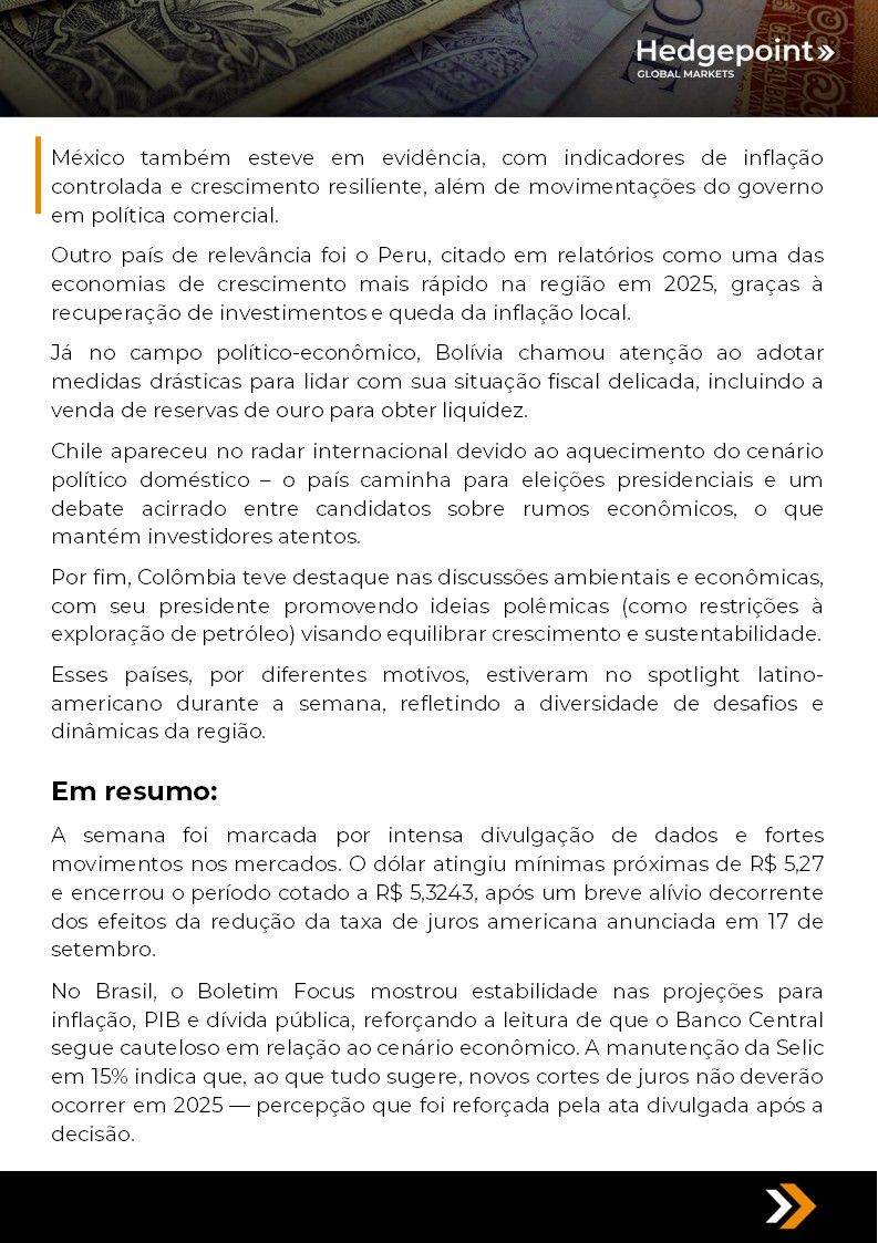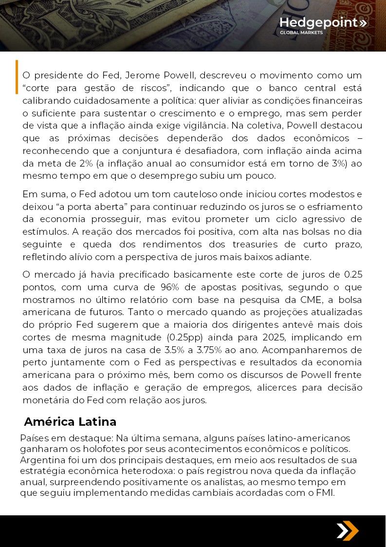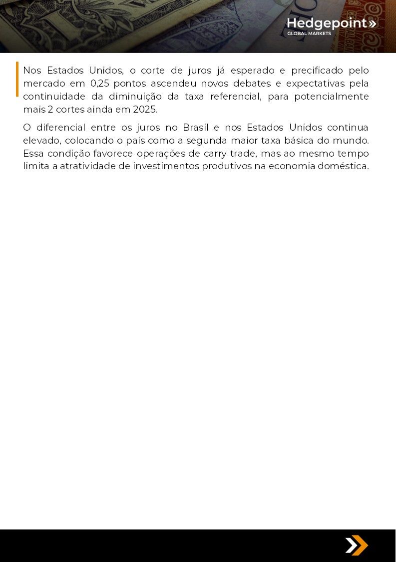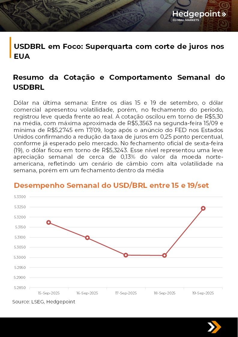 Este documento foi preparado pela Hedgepoint Schweiz AG e suas afiliadas (“Hedgepoint”) exclusivamente para fins informativos e instrutivos, sem a intenção de criar obrigações ou compromissos com terceiros. Não se destina a promover ou solicitar uma oferta de venda ou compra de quaisquer valores mobiliários, commodity interests ou produtos de investimento. A Hedgepoint e suas associadas renunciam expressamente a qualquer responsabilidade pelo uso das informações contidas neste documento que resulte, direta ou indiretamente, em qualquer tipo de dano. As informações são obtidas de fontes que acreditamos serem confiáveis, mas não garantimos a atualidade ou precisão dessas informações. O trading de commodity interests, como futuros, opções e swaps, envolve um risco substancial de perda e pode não ser adequado para todos os investidores. Você deve considerar cuidadosamente se esse tipo de negociação é adequado para você, levando em conta sua condição financeira. O desempenho passado não é necessariamente indicativo de resultados futuros. Os clientes devem confiar em seu próprio julgamento independente e/ou consultar seus consultores antes de realizar qualquer transação. A Hedgepoint não fornece consultoria jurídica, tributária ou contábil, sendo de sua responsabilidade buscar essas orientações separadamente. A Hedgepoint Schweiz AG está organizada, constituída e existente sob as leis da Suíça, é afiliada à ARIF, a Associação Romande des Intermédiaires Financiers, que é uma Organização de Autorregulação autorizada pela FINMA. A Hedgepoint Commodities LLC está organizada, constituída e existente sob as leis dos Estados Unidos, sendo autorizada e regulada pela Commodity Futures Trading Commission (CFTC) e é membro da National Futures Association (NFA), atuando como Introducing Broker e Commodity Trading Advisor. A HedgePoint Global Markets Limited é regulada pela Dubai Financial Services Authority. O conteúdo é direcionado a Clientes Profissionais e não a Clientes de Varejo. A Hedgepoint Global Markets PTE. Ltd está organizada, constituída e existente sob as leis de Singapura, isenta de obter uma licença de serviços financeiros conforme o Segundo Anexo do Securities and Futures (Licensing and Conduct of Business) Act, pela Monetary Authority of Singapore (MAS). A Hedgepoint Global Markets DTVM Ltda. é autorizada e regulada no Brasil pelo Banco Central do Brasil (BCB) e pela Comissão de Valores Mobiliários (CVM). Hedgepoint Serviços Ltda. está organizada, constituída e existente sob as leis do Brasil. A Hedgepoint Global Markets S.A. está organizada, constituída e existente sob as leis do Uruguai. Em caso de dúvidas não resolvidas no primeiro contato com o atendimento ao cliente (client.services@hedgepointglobal.com), entre em contato com o canal de ouvidoria interna (ombudsman@hedgepointglobal.com – global ou ouvidoria@hedgepointglobal.com – apenas Brasil) ou ligue para 0800-8788408 (apenas Brasil). Integridade, ética e transparência são valores que guiam nossa cultura. Para fortalecer ainda mais nossas práticas, a Hedgepoint possui um canal de denúncias para colaboradores e terceiros via e-mail ethicline@hedgepointglobal.com ou pelo formulário Ethic Line – Hedgepoint Global Markets. “HedgePoint” e o logotipo “HedgePoint” são marcas de uso exclusivo da HedgePoint e/ou de suas afiliadas. O uso ou reprodução é proibido, a menos que expressamente autorizado pela HedgePoint. Além disso, o uso de outras marcas neste documento foi autorizado apenas para fins de identificação. Isso, portanto, não implica quaisquer direitos da HedgePoint sobre essas marcas ou implica endosso, associação ou aprovação pelos proprietários dessas marcas com a HedgePoint ou suas afiliadas.