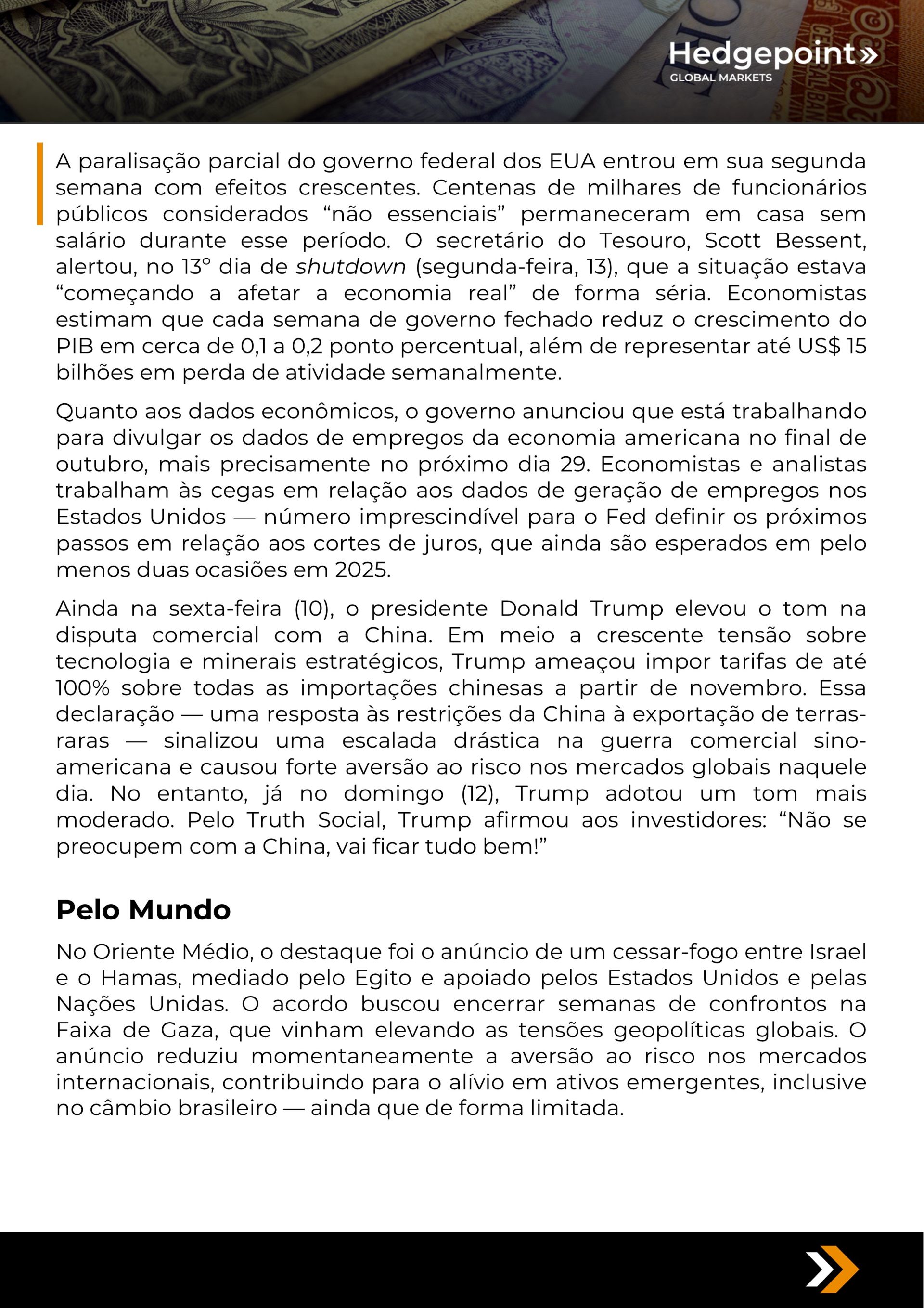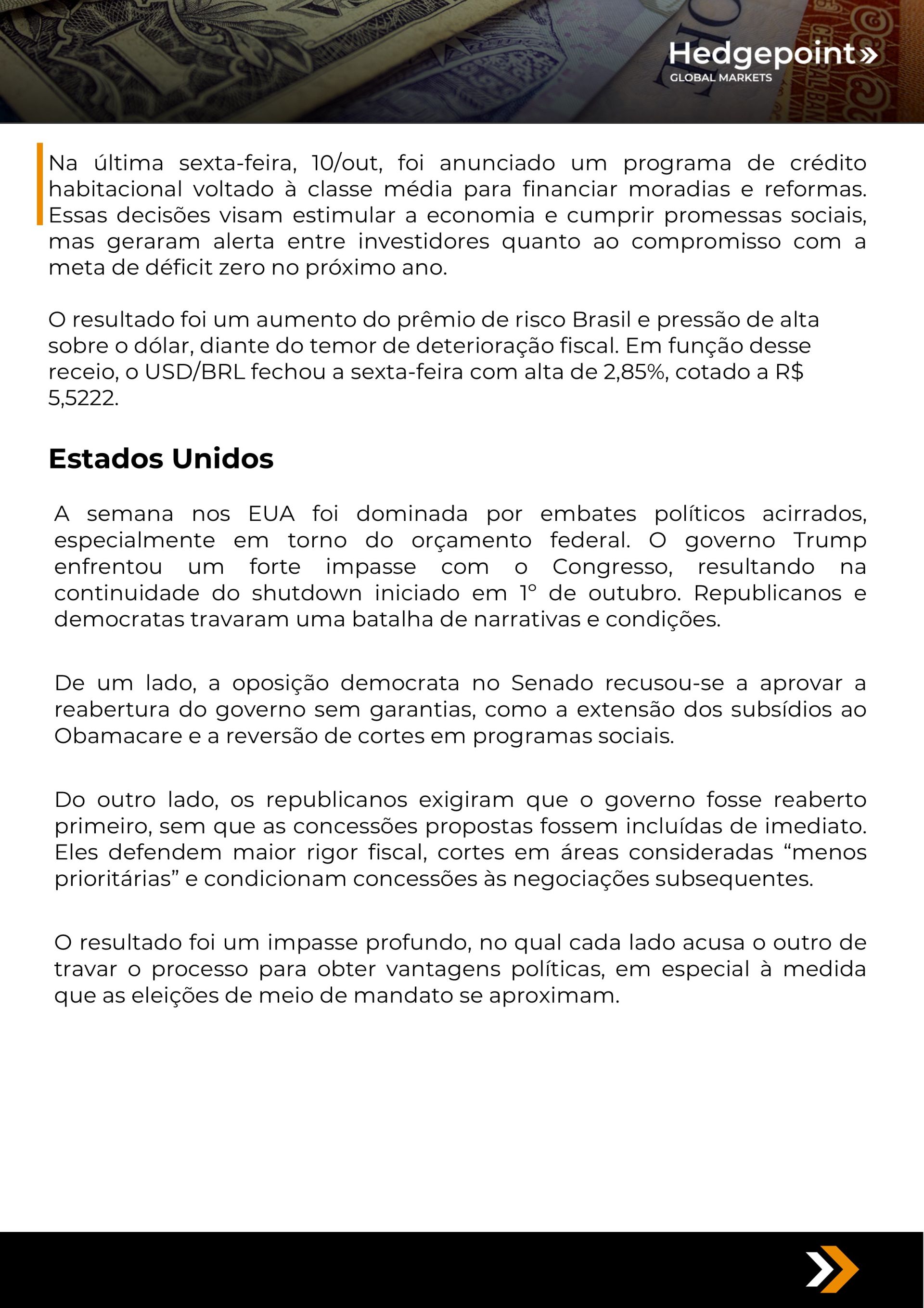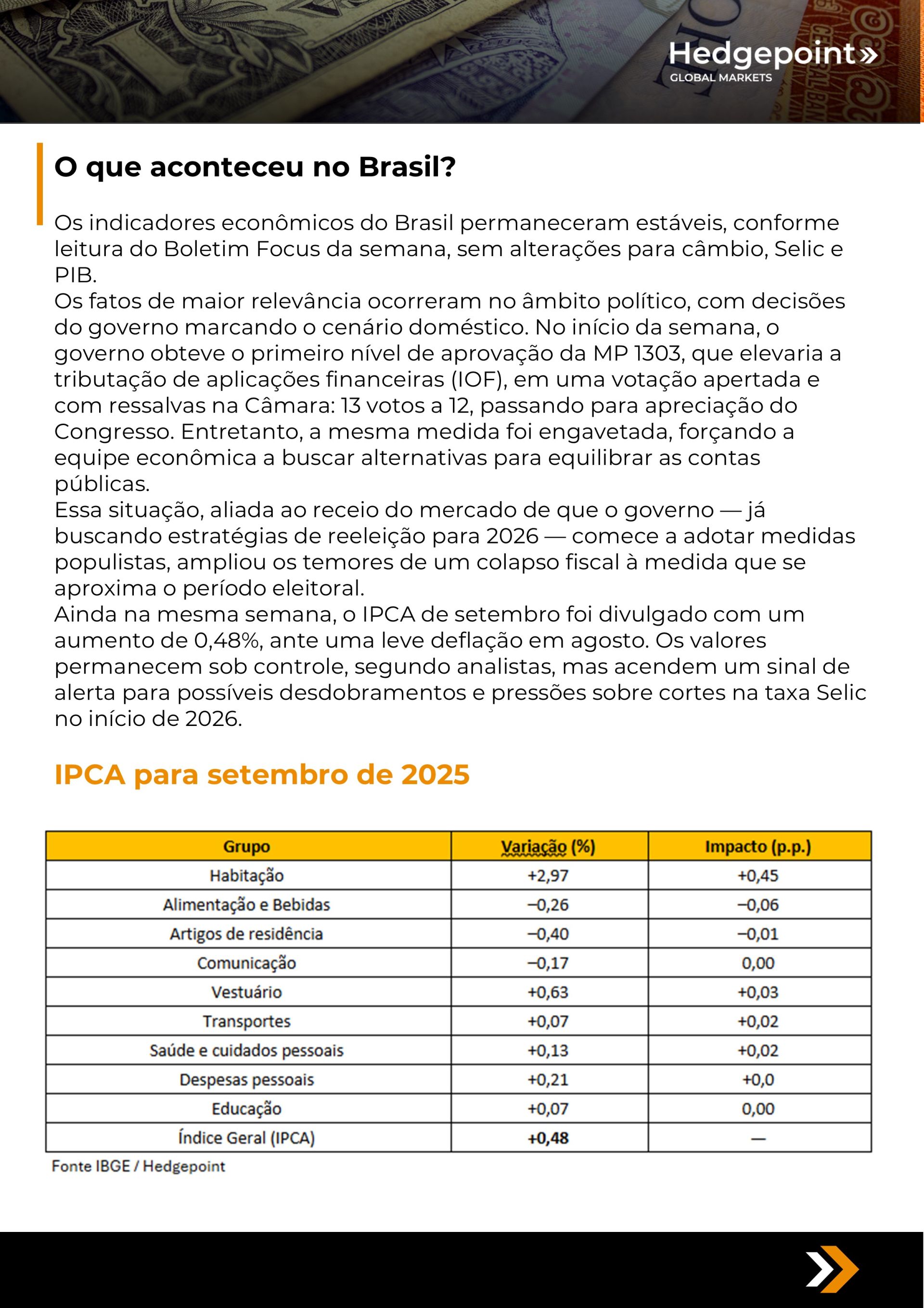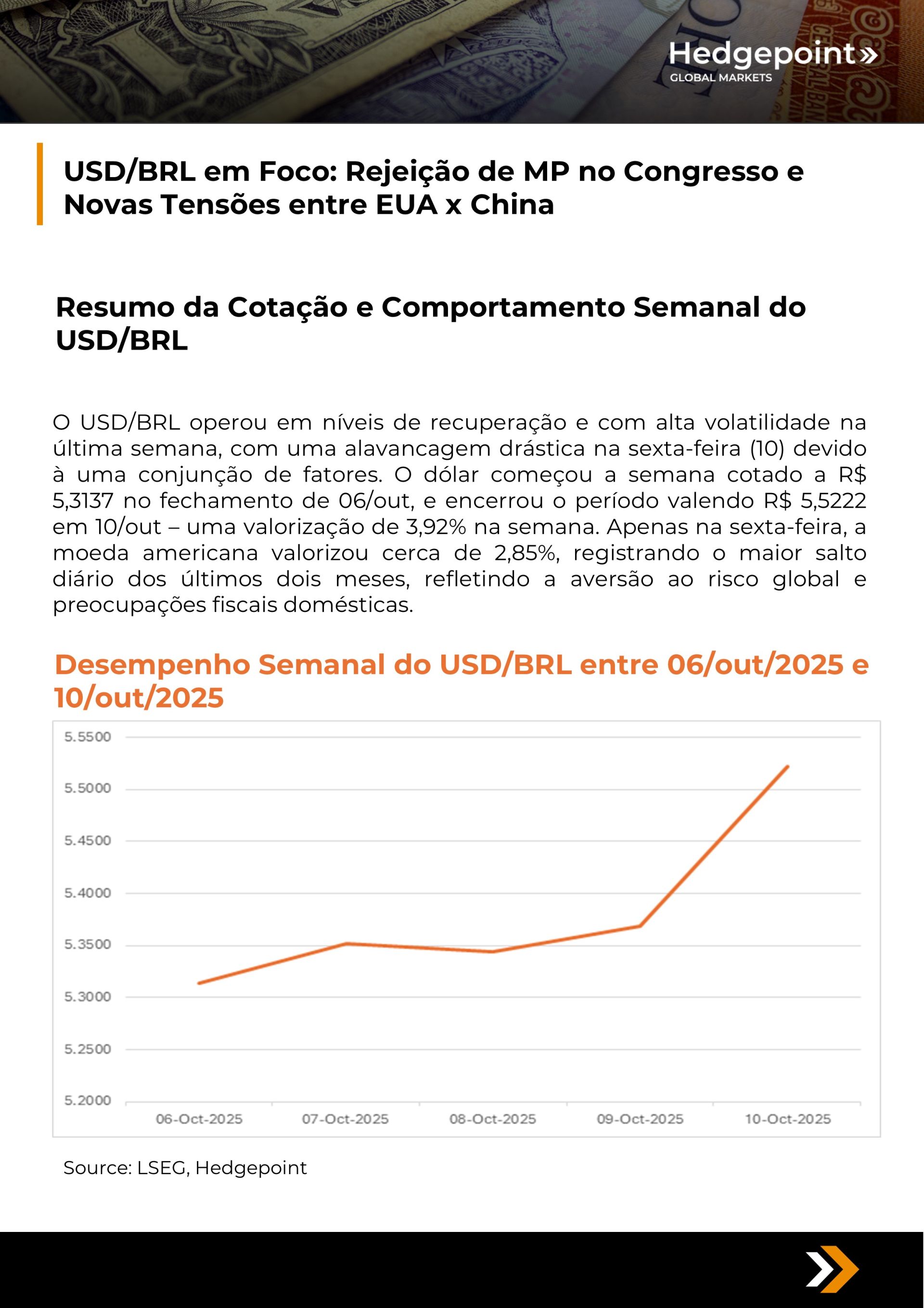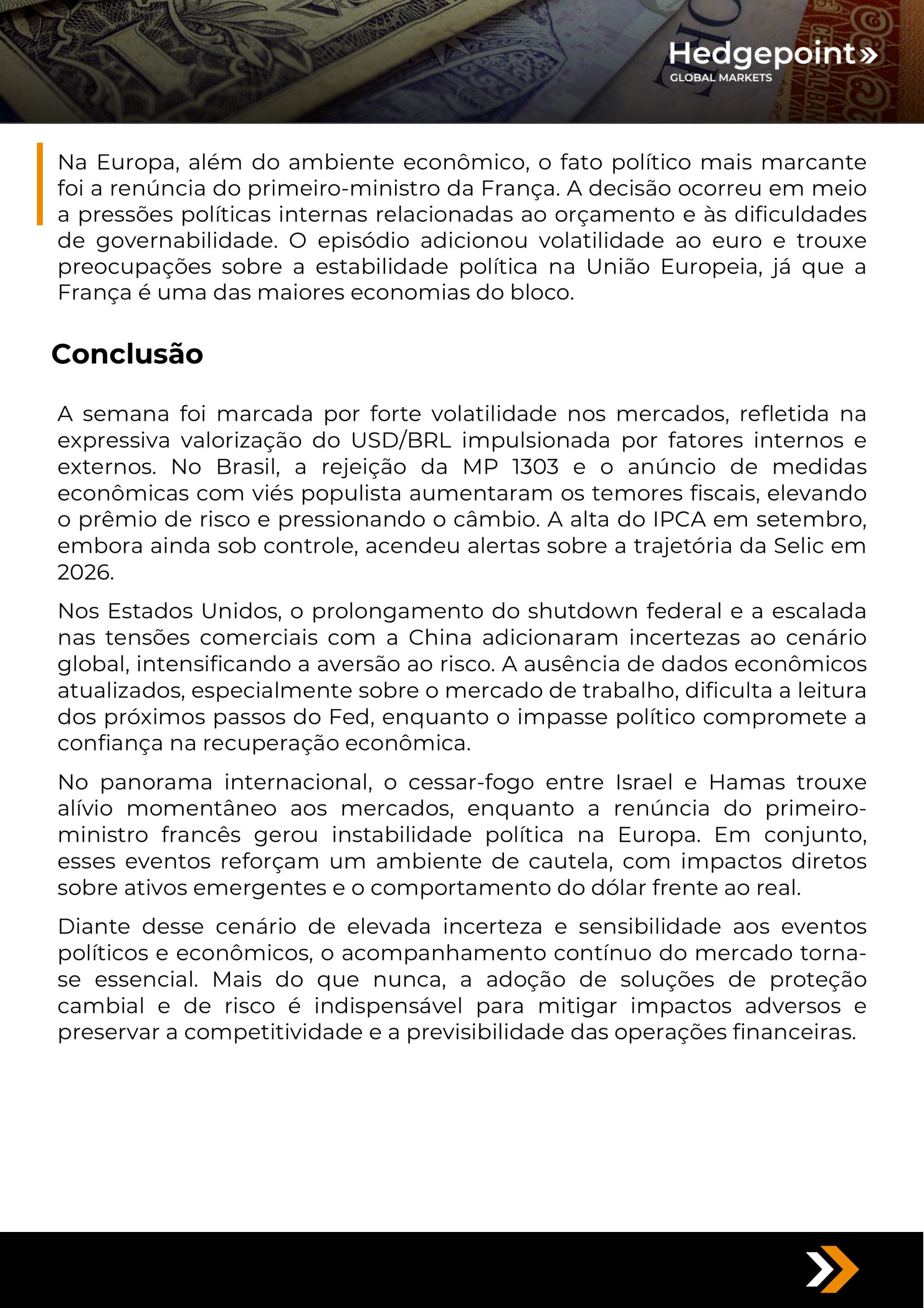 Este documento foi preparado pela Hedgepoint Schweiz AG e suas afiliadas (“Hedgepoint”) exclusivamente para fins informativos e instrutivos, sem a intenção de criar obrigações ou compromissos com terceiros. Não se destina a promover ou solicitar uma oferta de venda ou compra de quaisquer valores mobiliários, commodity interests ou produtos de investimento. A Hedgepoint e suas associadas renunciam expressamente a qualquer responsabilidade pelo uso das informações contidas neste documento que resulte, direta ou indiretamente, em qualquer tipo de dano. As informações são obtidas de fontes que acreditamos serem confiáveis, mas não garantimos a atualidade ou precisão dessas informações. O trading de commodity interests, como futuros, opções e swaps, envolve um risco substancial de perda e pode não ser adequado para todos os investidores. Você deve considerar cuidadosamente se esse tipo de negociação é adequado para você, levando em conta sua condição financeira. O desempenho passado não é necessariamente indicativo de resultados futuros. Os clientes devem confiar em seu próprio julgamento independente e/ou consultar seus consultores antes de realizar qualquer transação. A Hedgepoint não fornece consultoria jurídica, tributária ou contábil, sendo de sua responsabilidade buscar essas orientações separadamente. A Hedgepoint Schweiz AG está organizada, constituída e existente sob as leis da Suíça, é afiliada à ARIF, a Associação Romande des Intermédiaires Financiers, que é uma Organização de Autorregulação autorizada pela FINMA. A Hedgepoint Commodities LLC está organizada, constituída e existente sob as leis dos Estados Unidos, sendo autorizada e regulada pela Commodity Futures Trading Commission (CFTC) e é membro da National Futures Association (NFA), atuando como Introducing Broker e Commodity Trading Advisor. A HedgePoint Global Markets Limited é regulada pela Dubai Financial Services Authority. O conteúdo é direcionado a Clientes Profissionais e não a Clientes de Varejo. A Hedgepoint Global Markets PTE. Ltd está organizada, constituída e existente sob as leis de Singapura, isenta de obter uma licença de serviços financeiros conforme o Segundo Anexo do Securities and Futures (Licensing and Conduct of Business) Act, pela Monetary Authority of Singapore (MAS). A Hedgepoint Global Markets DTVM Ltda. é autorizada e regulada no Brasil pelo Banco Central do Brasil (BCB) e pela Comissão de Valores Mobiliários (CVM). Hedgepoint Serviços Ltda. está organizada, constituída e existente sob as leis do Brasil. A Hedgepoint Global Markets S.A. está organizada, constituída e existente sob as leis do Uruguai. Em caso de dúvidas não resolvidas no primeiro contato com o atendimento ao cliente (client.services@hedgepointglobal.com), entre em contato com o canal de ouvidoria interna (ombudsman@hedgepointglobal.com – global ou ouvidoria@hedgepointglobal.com – apenas Brasil) ou ligue para 0800-8788408 (apenas Brasil). Integridade, ética e transparência são valores que guiam nossa cultura. Para fortalecer ainda mais nossas práticas, a Hedgepoint possui um canal de denúncias para colaboradores e terceiros via e-mail ethicline@hedgepointglobal.com ou pelo formulário Ethic Line – Hedgepoint Global Markets. “HedgePoint” e o logotipo “HedgePoint” são marcas de uso exclusivo da HedgePoint e/ou de suas afiliadas. O uso ou reprodução é proibido, a menos que expressamente autorizado pela HedgePoint. Além disso, o uso de outras marcas neste documento foi autorizado apenas para fins de identificação. Isso, portanto, não implica quaisquer direitos da HedgePoint sobre essas marcas ou implica endosso, associação ou aprovação pelos proprietários dessas marcas com a HedgePoint ou suas afiliadas.