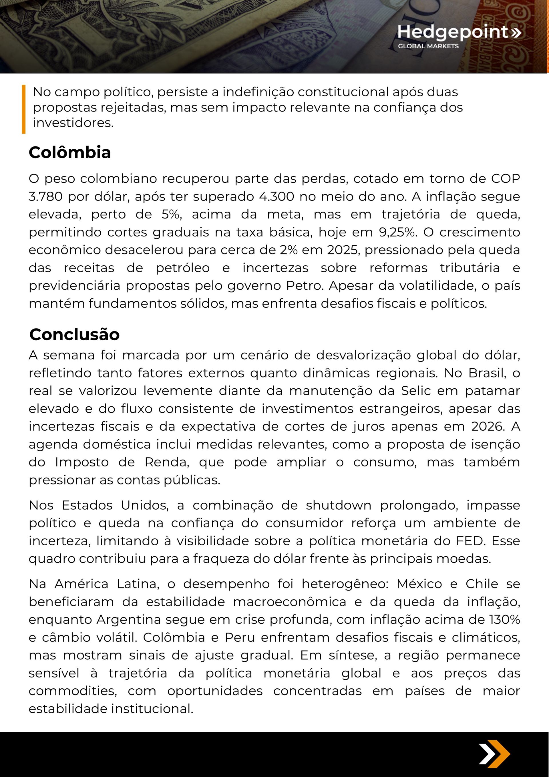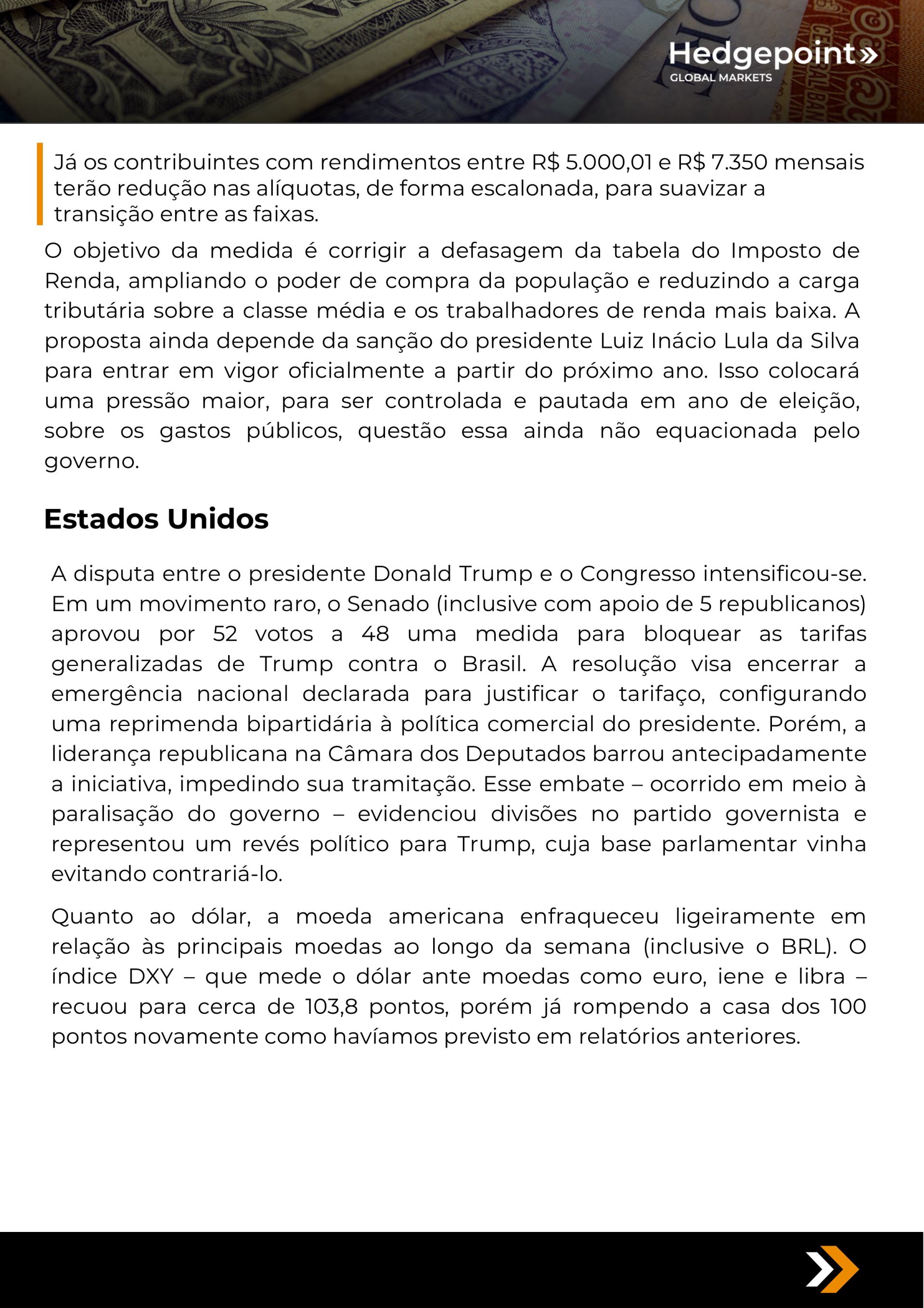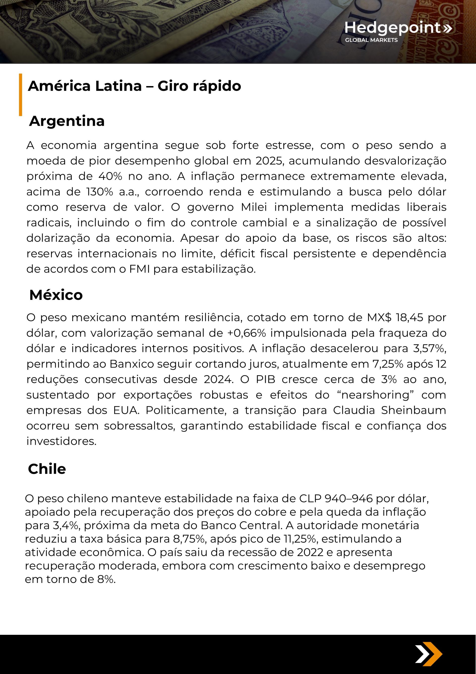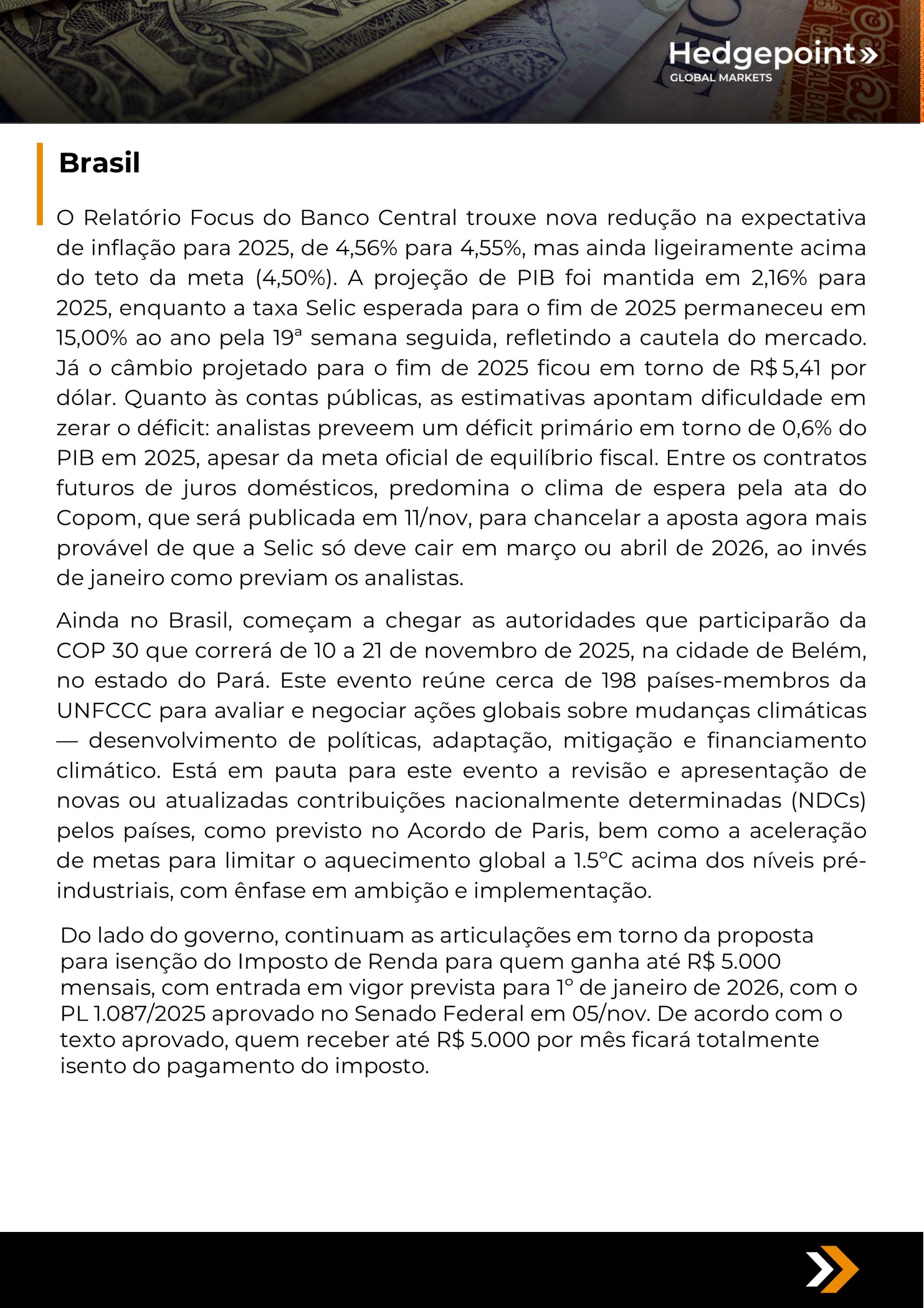 Este documento foi preparado pela Hedgepoint Schweiz AG e suas afiliadas (“Hedgepoint”) exclusivamente para fins informativos e instrutivos, sem a intenção de criar obrigações ou compromissos com terceiros. Não se destina a promover ou solicitar uma oferta de venda ou compra de quaisquer valores mobiliários, commodity interests ou produtos de investimento. A Hedgepoint e suas associadas renunciam expressamente a qualquer responsabilidade pelo uso das informações contidas neste documento que resulte, direta ou indiretamente, em qualquer tipo de dano. As informações são obtidas de fontes que acreditamos serem confiáveis, mas não garantimos a atualidade ou precisão dessas informações. O trading de commodity interests, como futuros, opções e swaps, envolve um risco substancial de perda e pode não ser adequado para todos os investidores. Você deve considerar cuidadosamente se esse tipo de negociação é adequado para você, levando em conta sua condição financeira. O desempenho passado não é necessariamente indicativo de resultados futuros. Os clientes devem confiar em seu próprio julgamento independente e/ou consultar seus consultores antes de realizar qualquer transação. A Hedgepoint não fornece consultoria jurídica, tributária ou contábil, sendo de sua responsabilidade buscar essas orientações separadamente. A Hedgepoint Schweiz AG está organizada, constituída e existente sob as leis da Suíça, é afiliada à ARIF, a Associação Romande des Intermédiaires Financiers, que é uma Organização de Autorregulação autorizada pela FINMA. A Hedgepoint Commodities LLC está organizada, constituída e existente sob as leis dos Estados Unidos, sendo autorizada e regulada pela Commodity Futures Trading Commission (CFTC) e é membro da National Futures Association (NFA), atuando como Introducing Broker e Commodity Trading Advisor. A HedgePoint Global Markets Limited é regulada pela Dubai Financial Services Authority. O conteúdo é direcionado a Clientes Profissionais e não a Clientes de Varejo. A Hedgepoint Global Markets PTE. Ltd está organizada, constituída e existente sob as leis de Singapura, isenta de obter uma licença de serviços financeiros conforme o Segundo Anexo do Securities and Futures (Licensing and Conduct of Business) Act, pela Monetary Authority of Singapore (MAS). A Hedgepoint Global Markets DTVM Ltda. é autorizada e regulada no Brasil pelo Banco Central do Brasil (BCB) e pela Comissão de Valores Mobiliários (CVM). Hedgepoint Serviços Ltda. está organizada, constituída e existente sob as leis do Brasil. A Hedgepoint Global Markets S.A. está organizada, constituída e existente sob as leis do Uruguai. Em caso de dúvidas não resolvidas no primeiro contato com o atendimento ao cliente (client.services@hedgepointglobal.com), entre em contato com o canal de ouvidoria interna (ombudsman@hedgepointglobal.com – global ou ouvidoria@hedgepointglobal.com – apenas Brasil) ou ligue para 0800-8788408 (apenas Brasil). Integridade, ética e transparência são valores que guiam nossa cultura. Para fortalecer ainda mais nossas práticas, a Hedgepoint possui um canal de denúncias para colaboradores e terceiros via e-mail ethicline@hedgepointglobal.com ou pelo formulário Ethic Line – Hedgepoint Global Markets. “HedgePoint” e o logotipo “HedgePoint” são marcas de uso exclusivo da HedgePoint e/ou de suas afiliadas. O uso ou reprodução é proibido, a menos que expressamente autorizado pela HedgePoint. Além disso, o uso de outras marcas neste documento foi autorizado apenas para fins de identificação. Isso, portanto, não implica quaisquer direitos da HedgePoint sobre essas marcas ou implica endosso, associação ou aprovação pelos proprietários dessas marcas com a HedgePoint ou suas afiliadas.