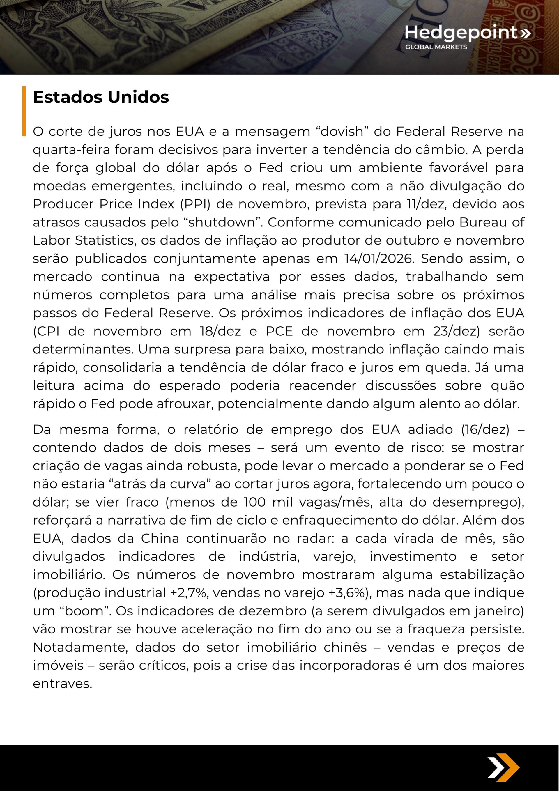 Este documento foi preparado pela Hedgepoint Schweiz AG e suas afiliadas (“Hedgepoint”) exclusivamente para fins informativos e instrutivos, sem a intenção de criar obrigações ou compromissos com terceiros. Não se destina a promover ou solicitar uma oferta de venda ou compra de quaisquer valores mobiliários, commodity interests ou produtos de investimento. A Hedgepoint e suas associadas renunciam expressamente a qualquer responsabilidade pelo uso das informações contidas neste documento que resulte, direta ou indiretamente, em qualquer tipo de dano. As informações são obtidas de fontes que acreditamos serem confiáveis, mas não garantimos a atualidade ou precisão dessas informações. O trading de commodity interests, como futuros, opções e swaps, envolve um risco substancial de perda e pode não ser adequado para todos os investidores. Você deve considerar cuidadosamente se esse tipo de negociação é adequado para você, levando em conta sua condição financeira. O desempenho passado não é necessariamente indicativo de resultados futuros. Os clientes devem confiar em seu próprio julgamento independente e/ou consultar seus consultores antes de realizar qualquer transação. A Hedgepoint não fornece consultoria jurídica, tributária ou contábil, sendo de sua responsabilidade buscar essas orientações separadamente. A Hedgepoint Schweiz AG está organizada, constituída e existente sob as leis da Suíça, é afiliada à ARIF, a Associação Romande des Intermédiaires Financiers, que é uma Organização de Autorregulação autorizada pela FINMA. A Hedgepoint Commodities LLC está organizada, constituída e existente sob as leis dos Estados Unidos, sendo autorizada e regulada pela Commodity Futures Trading Commission (CFTC) e é membro da National Futures Association (NFA), atuando como Introducing Broker e Commodity Trading Advisor. A HedgePoint Global Markets Limited é regulada pela Dubai Financial Services Authority. O conteúdo é direcionado a Clientes Profissionais e não a Clientes de Varejo. A Hedgepoint Global Markets PTE. Ltd está organizada, constituída e existente sob as leis de Singapura, isenta de obter uma licença de serviços financeiros conforme o Segundo Anexo do Securities and Futures (Licensing and Conduct of Business) Act, pela Monetary Authority of Singapore (MAS). A Hedgepoint Global Markets DTVM Ltda. é autorizada e regulada no Brasil pelo Banco Central do Brasil (BCB) e pela Comissão de Valores Mobiliários (CVM). Hedgepoint Serviços Ltda. está organizada, constituída e existente sob as leis do Brasil. A Hedgepoint Global Markets S.A. está organizada, constituída e existente sob as leis do Uruguai. Em caso de dúvidas não resolvidas no primeiro contato com o atendimento ao cliente (client.services@hedgepointglobal.com), entre em contato com o canal de ouvidoria interna (ombudsman@hedgepointglobal.com – global ou ouvidoria@hedgepointglobal.com – apenas Brasil) ou ligue para 0800-8788408 (apenas Brasil). Integridade, ética e transparência são valores que guiam nossa cultura. Para fortalecer ainda mais nossas práticas, a Hedgepoint possui um canal de denúncias para colaboradores e terceiros via e-mail ethicline@hedgepointglobal.com ou pelo formulário Ethic Line – Hedgepoint Global Markets. “HedgePoint” e o logotipo “HedgePoint” são marcas de uso exclusivo da HedgePoint e/ou de suas afiliadas. O uso ou reprodução é proibido, a menos que expressamente autorizado pela HedgePoint. Além disso, o uso de outras marcas neste documento foi autorizado apenas para fins de identificação. Isso, portanto, não implica quaisquer direitos da HedgePoint sobre essas marcas ou implica endosso, associação ou aprovação pelos proprietários dessas marcas com a HedgePoint ou suas afiliadas.