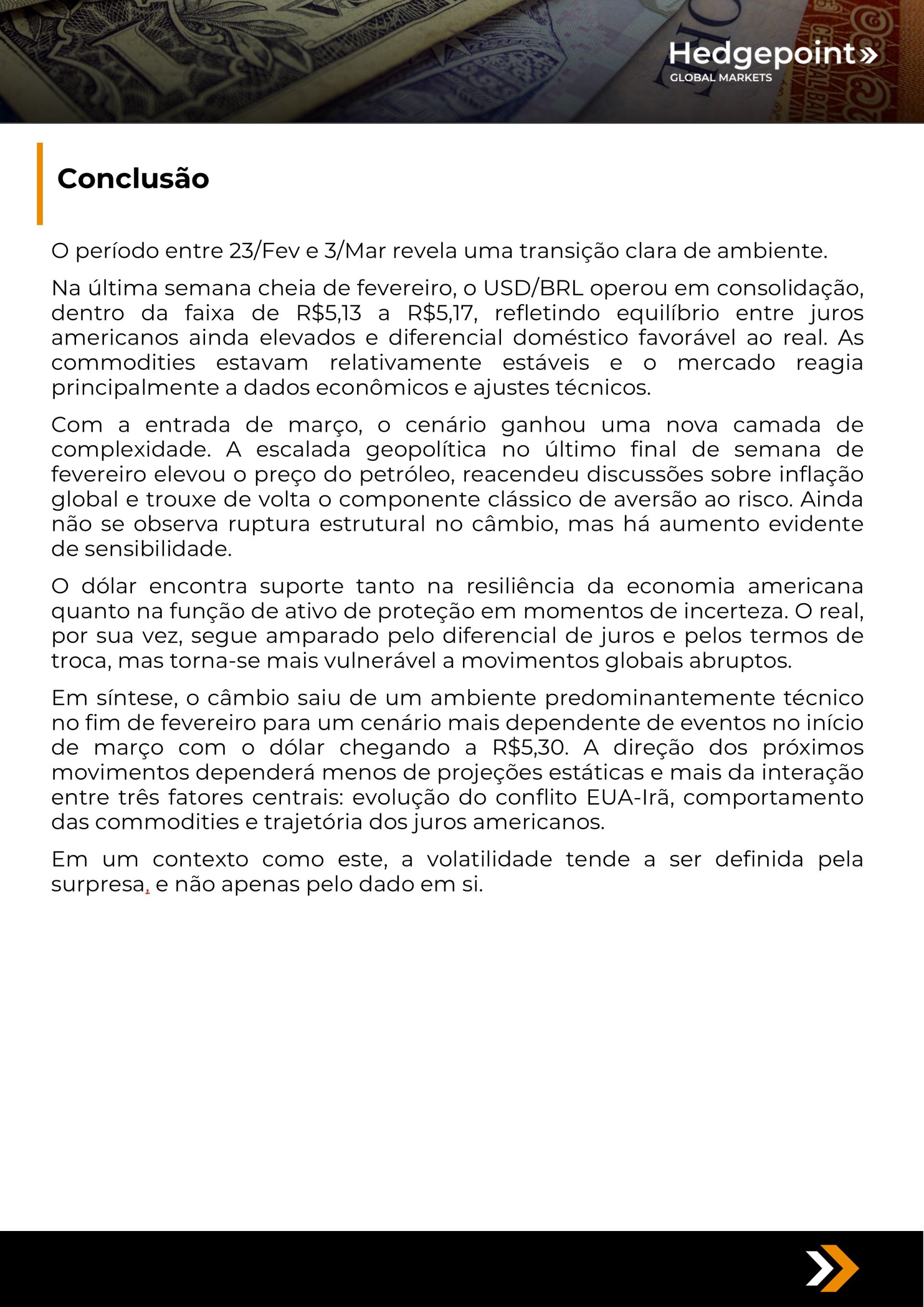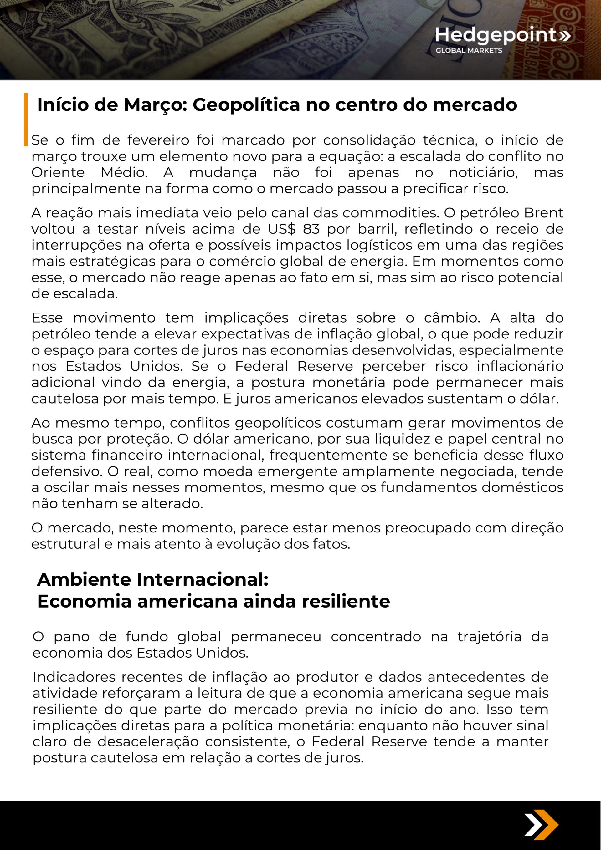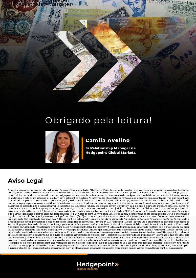 Este documento foi preparado pela Hedgepoint Schweiz AG e suas afiliadas (“Hedgepoint”) exclusivamente para fins informativos e instrutivos, sem a intenção de criar obrigações ou compromissos com terceiros. Não se destina a promover ou solicitar uma oferta de venda ou compra de quaisquer valores mobiliários, commodity interests ou produtos de investimento. A Hedgepoint e suas associadas renunciam expressamente a qualquer responsabilidade pelo uso das informações contidas neste documento que resulte, direta ou indiretamente, em qualquer tipo de dano. As informações são obtidas de fontes que acreditamos serem confiáveis, mas não garantimos a atualidade ou precisão dessas informações. O trading de commodity interests, como futuros, opções e swaps, envolve um risco substancial de perda e pode não ser adequado para todos os investidores. Você deve considerar cuidadosamente se esse tipo de negociação é adequado para você, levando em conta sua condição financeira. O desempenho passado não é necessariamente indicativo de resultados futuros. Os clientes devem confiar em seu próprio julgamento independente e/ou consultar seus consultores antes de realizar qualquer transação. A Hedgepoint não fornece consultoria jurídica, tributária ou contábil, sendo de sua responsabilidade buscar essas orientações separadamente. A Hedgepoint Schweiz AG está organizada, constituída e existente sob as leis da Suíça, é afiliada à ARIF, a Associação Romande des Intermédiaires Financiers, que é uma Organização de Autorregulação autorizada pela FINMA. A Hedgepoint Commodities LLC está organizada, constituída e existente sob as leis dos Estados Unidos, sendo autorizada e regulada pela Commodity Futures Trading Commission (CFTC) e é membro da National Futures Association (NFA), atuando como Introducing Broker e Commodity Trading Advisor. A HedgePoint Global Markets Limited é regulada pela Dubai Financial Services Authority. O conteúdo é direcionado a Clientes Profissionais e não a Clientes de Varejo. A Hedgepoint Global Markets PTE. Ltd está organizada, constituída e existente sob as leis de Singapura, isenta de obter uma licença de serviços financeiros conforme o Segundo Anexo do Securities and Futures (Licensing and Conduct of Business) Act, pela Monetary Authority of Singapore (MAS). A Hedgepoint Global Markets DTVM Ltda. é autorizada e regulada no Brasil pelo Banco Central do Brasil (BCB) e pela Comissão de Valores Mobiliários (CVM). Hedgepoint Serviços Ltda. está organizada, constituída e existente sob as leis do Brasil. A Hedgepoint Global Markets S.A. está organizada, constituída e existente sob as leis do Uruguai. Em caso de dúvidas não resolvidas no primeiro contato com o atendimento ao cliente (client.services@hedgepointglobal.com), entre em contato com o canal de ouvidoria interna (ombudsman@hedgepointglobal.com – global ou ouvidoria@hedgepointglobal.com – apenas Brasil) ou ligue para 0800-8788408 (apenas Brasil). Integridade, ética e transparência são valores que guiam nossa cultura. Para fortalecer ainda mais nossas práticas, a Hedgepoint possui um canal de denúncias para colaboradores e terceiros via e-mail ethicline@hedgepointglobal.com ou pelo formulário Ethic Line – Hedgepoint Global Markets. “HedgePoint” e o logotipo “HedgePoint” são marcas de uso exclusivo da HedgePoint e/ou de suas afiliadas. O uso ou reprodução é proibido, a menos que expressamente autorizado pela HedgePoint. Além disso, o uso de outras marcas neste documento foi autorizado apenas para fins de identificação. Isso, portanto, não implica quaisquer direitos da HedgePoint sobre essas marcas ou implica endosso, associação ou aprovação pelos proprietários dessas marcas com a HedgePoint ou suas afiliadas.
