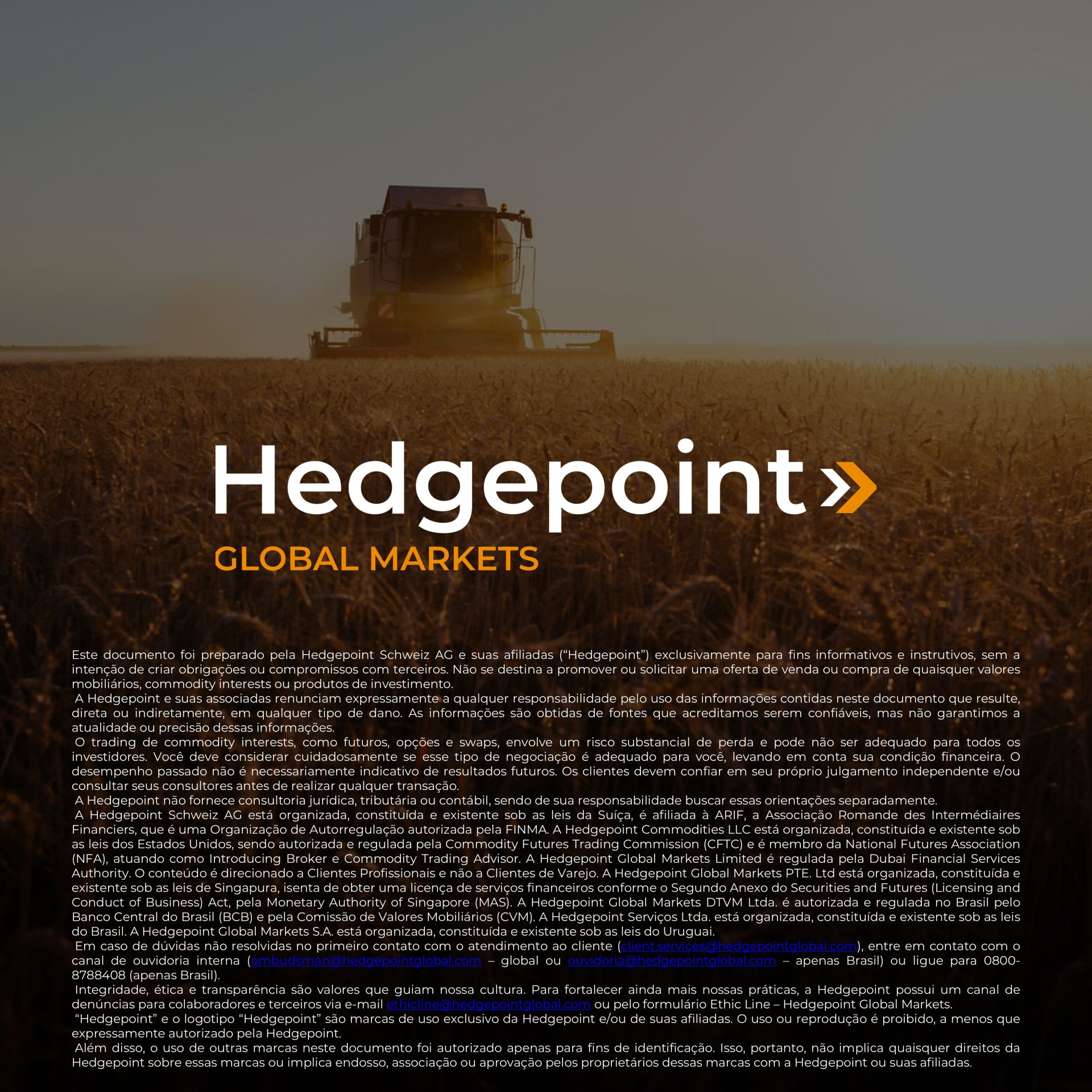 Este documento foi preparado pela Hedgepoint Global Markets LLC e suas afiliadas (“HPGM”) exclusivamente com fins informativos e instrucionais, não tendo o propósito de estabelecer obrigações ou compromissos à terceiros, nem a intenção de promover uma oferta, ou solicitação de oferta de compra ou venda de quaisquer valores mobiliários, futuros, opções, moedas e swap ou produtos de investimento. A Hedgepoint Commodities LLC (“HPC”), uma entidade de propriedade integral do HPGM, é uma Introducing Broker e um membro registrado do National Futures Association. A negociação de futuros, opções, moedas e swap envolve riscos significativos de perdas e pode não ser adequado para todos os investidores. Performance anterior não é necessariamente indicativo de resultados no futuro. Os clientes da Hedgepoint devem confiar em seu próprio julgamento independente e em consultores externos antes de entrar em qualquer transação que seja introduzida pela empresa. A HPGM e seus associados expressamente não se responsabiliza por qualquer uso das informações contidas neste documento que resulte direta ou indiretamente em danos ou prejuízos de qualquer tipo. Em caso de questionamentos não resolvidos por nossa equipe de atendimento ao cliente (client.services@hedgepointglobal.com), contate nosso canal de ombudsman interno (ombudsman@hedgepointglobal.com) ou 0800-878 8408/ouvidoria@hedgepointglobal.com (somente para clientes no Brasil).”