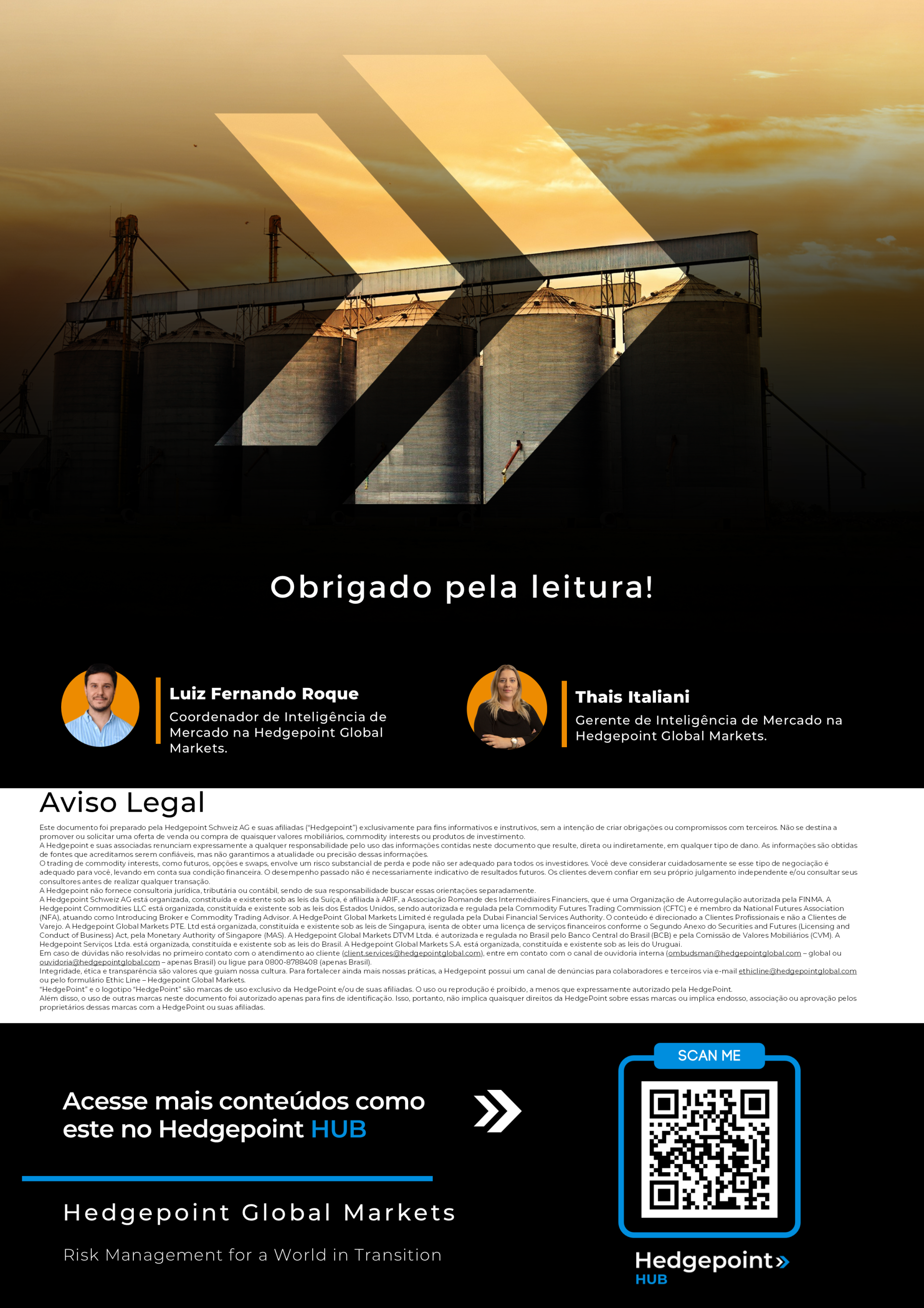Este documento foi preparado pela Hedgepoint Global Markets LLC e suas afiliadas (“HPGM”) exclusivamente com fins informativos e instrucionais, não tendo o propósito de estabelecer obrigações ou compromissos à terceiros, nem a intenção de promover uma oferta, ou solicitação de oferta de compra ou venda de quaisquer valores mobiliários, futuros, opções, moedas e swap ou produtos de investimento. A Hedgepoint Commodities LLC (“HPC”), uma entidade de propriedade integral do HPGM, é uma Introducing Broker e um membro registrado do National Futures Association. A negociação de futuros, opções, moedas e swap envolve riscos significativos de perdas e pode não ser adequado para todos os investidores. Performance anterior não é necessariamente indicativo de resultados no futuro. Os clientes da Hedgepoint devem confiar em seu próprio julgamento independente e em consultores externos antes de entrar em qualquer transação que seja introduzida pela empresa. A HPGM e seus associados expressamente não se responsabiliza por qualquer uso das informações contidas neste documento que resulte direta ou indiretamente em danos ou prejuízos de qualquer tipo. Em caso de questionamentos não resolvidos por nossa equipe de atendimento ao cliente (client.services@hedgepointglobal.com), contate nosso canal de ombudsman interno (ombudsman@hedgepointglobal.com) ou 0800-878 8408/ouvidoria@hedgepointglobal.com (somente para clientes no Brasil).”