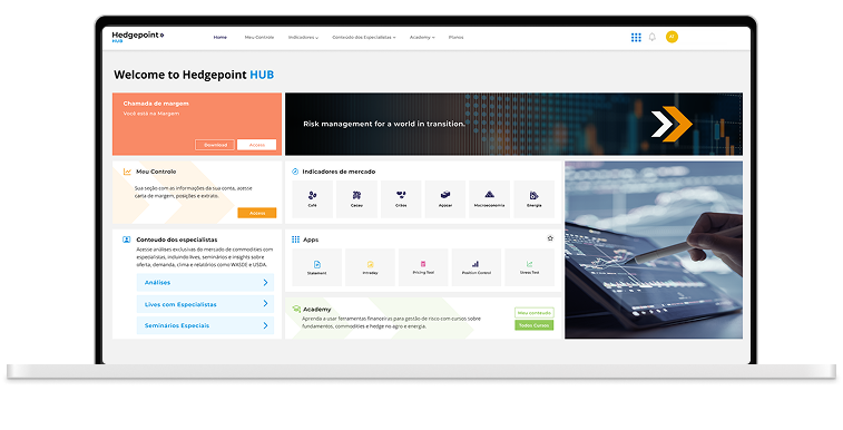 O Hedgepoint HUB é uma plataforma digital completa que reúne análises globais dos mercados de commodities, conteúdos educacionais sobre gestão de riscos financeiros e ferramentas de monitoramento de posições para auxiliar empresas na estratégia de hedge e proteção de preço e câmbio.